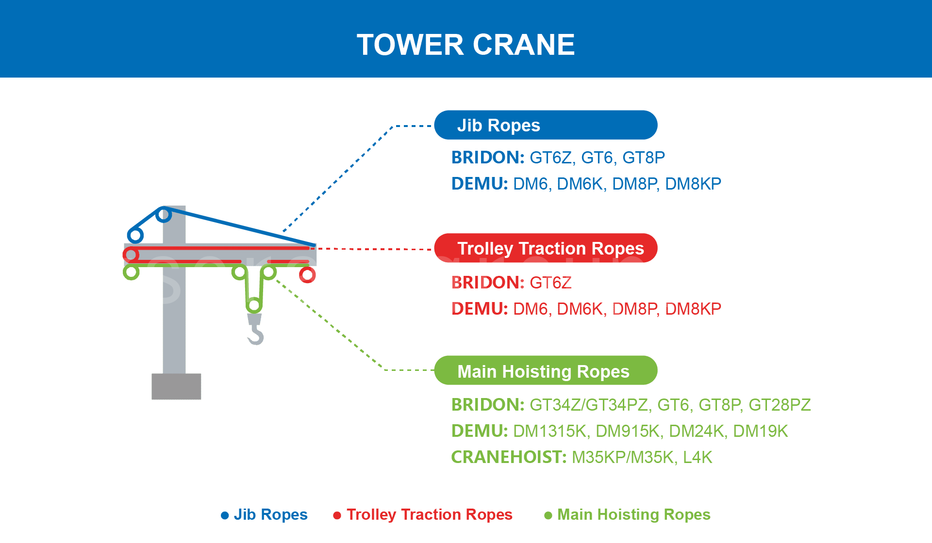 Пры выбары кранавых вяровак неабходна ўлічваць шэраг фактараў, каб пераканацца, што вяроўка выбрана правільна для канкрэтнага прымянення і тэхнічных патрабаванняў. Для розных частак рознага абсталявання патрабуюцца розныя вяроўкі. Як выбраць трос для крана? Ніжэй вы можаце абагульніць розныя тыпы кранаў, якія адпавядаюць тыпу драцянога троса, каб дапамагчы вам лёгка выбраць правільны кранавы трос. тросы кантэйнернага крана Дротавыя канаты вежавага крана Тэлескапічныя аўтакраны канатныя падвесныя краны канаты Ліццё кранавых канатаў Драцяныя тросы для разгрузкі суднаў Пляцоўка мабільных кантэйнерных кранаў канатная пад'ёмны шкіў тросы Дротавыя канаты марскіх кранаў Канатная канавачная машына для дроту Берагавыя краны канаты Гусенічныя краны канаты Палубныя краны тросы Тросы плавучых кранаў канаты ротарнай свідравой ўстаноўкі Дротавыя канаты для разведачных буравых установак